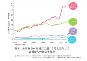「がん」というと50代以降にリスクが高くなるイメージがありますが、今、20~40代の若い女性に、乳がん、卵巣がん、子宮体がん、子宮頸がんなど、ホルモンと深くかかわるがんが増えています。
